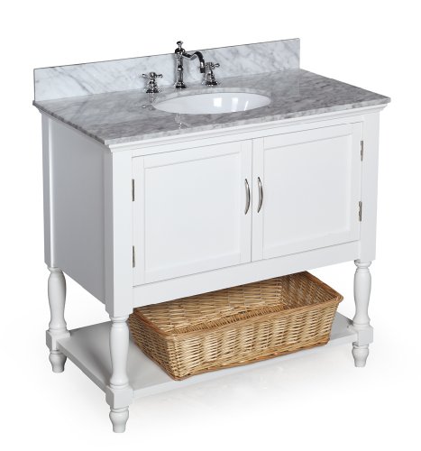 The Beverly 36-inch Bathroom Vanity (Carrera/White): This sleek & contemporary bathroom vanity set includes a white solid wood cabinet, a natural 3/4" thick Carrera marble countertop, an undermount ceramic sink, a pop-up drain, a P-trap, and a wicker basket. Pictured backsplash and faucet are not included! However, order now and we will include a chrome three-hole faucet and matching backsplash as a free gift! All vanities come fully assembled by the manufacturer, with countertop & sink pre-installed.