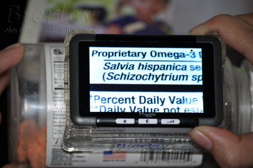 Maggie-Pro is an ultra-compact handheld electronic magnifier that you can easily slip into most purses or pockets, and even some wallets. It offers 4 magnification levels (4x, 6x, 8x and 11x) and two bright LED's for dim lighting conditions which can also be used as an emergency flashlight. Freeze allows you to capture an image on the 3-inch wide screen LCD for closer examination, plus an Acrylic stand is included for hands free use.